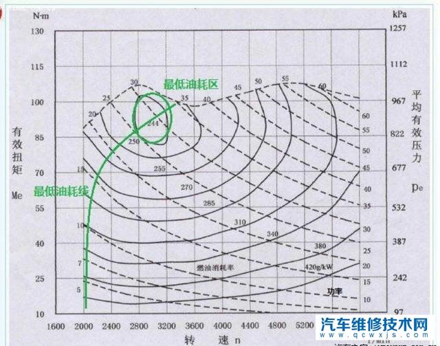 橫坐標是發動機轉速,圖左側的縱坐標則是發動機是有效扭矩,圖右側的縱坐標則是平均有效壓力,內部虛線則是等功率線,實線則是等燃油消耗率線,圈內標注的區域則是最低油耗區。不同發動機特性不同,但是都會有一個高效區,例如轉速在xxx轉/分的時候發動機效率最高,消耗同樣數量的燃油可以做更多的功。