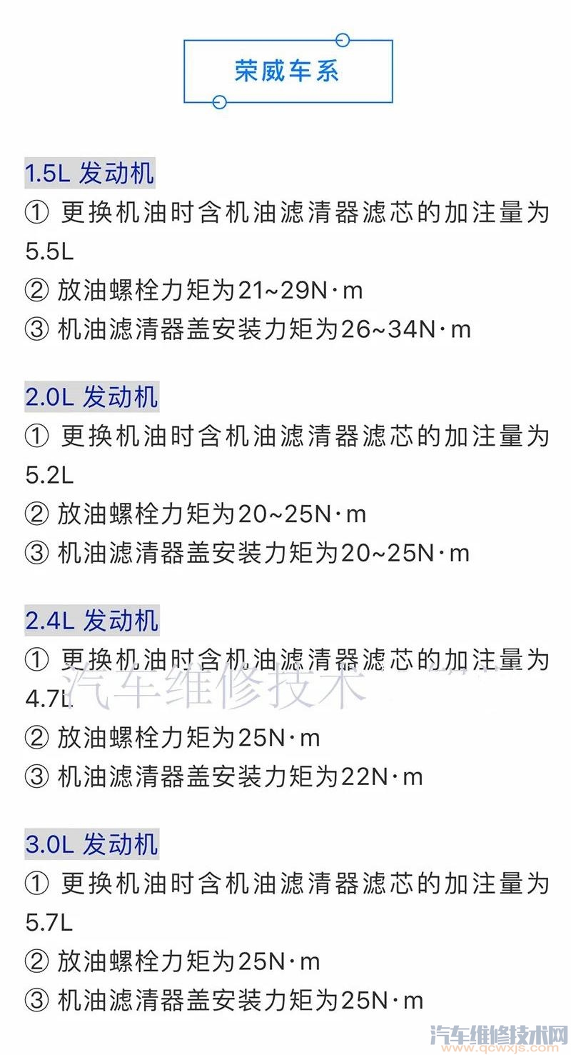①更換機油時含機油濾清器濾芯的加注量為6.5L