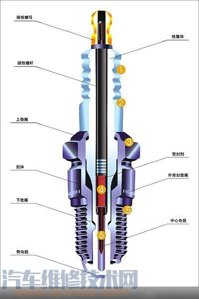火花塞的構(gòu)造,中心電極用鎳鉻合金制成,具有良好的耐高溫、耐蝕性能,中心電極做成兩段,中間加有導(dǎo)電玻璃,由于導(dǎo)電玻璃和瓷絕緣體的膨脹系數(shù)相近,因此,導(dǎo)電玻璃主要是起密封作用?;鸹ㄈg隙多為1.0~1.2mm。