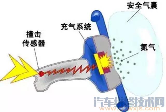 在中央電子控制器中有對安全氣囊進(jìn)行監(jiān)控的處理器,處理器會計(jì)算碰撞力度,如果碰撞力度超過預(yù)先的設(shè)定值,中央處理器會立即發(fā)出指令,使電脈沖火花引燃?xì)怏w發(fā)生器中的雷管,使其爆炸。