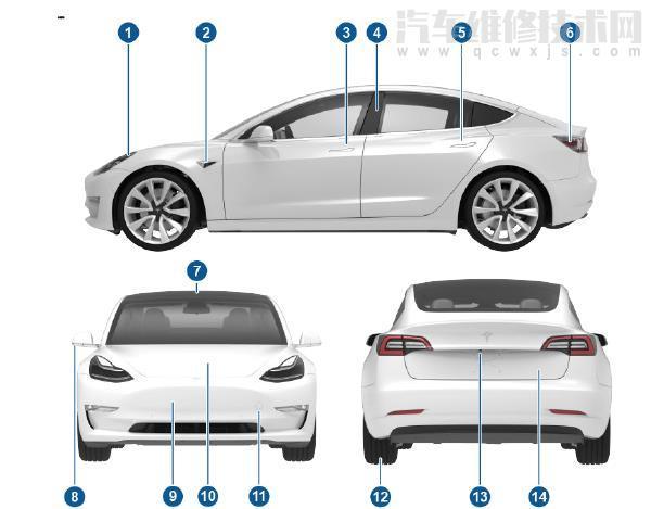 1. 外部車燈2. Autopilot 自動輔助駕駛攝像頭 3. 前車門把手 4. 鑰匙卡傳感器 (鑰匙 見第 7 頁)、Autopilot 自動輔助駕駛攝像頭5. 后車門把手 原創 http://www.011315.cn/6. 充電端口7. Autopilot 自動輔助駕駛攝像頭8. 外部后視鏡9. 雷達傳感器(隱藏)10. 前備箱蓋/前備箱前備箱 11. 牽引孔蓋 12. 車輪和輪胎13. 后視攝像頭14. 后備箱
