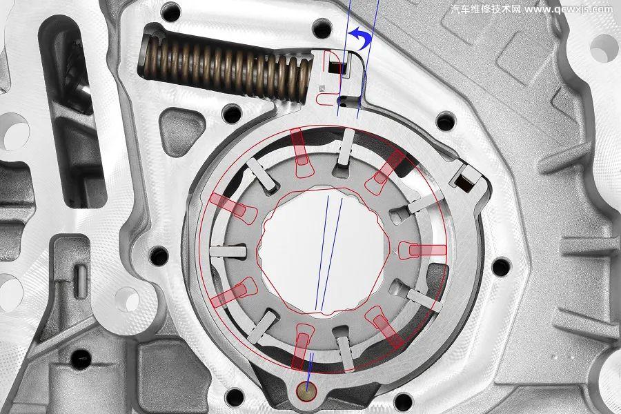 大多數變排量機油泵都是由發動機控制單元ECU控制電磁閥進行工作,電磁閥動作,改變調節環圓心與泵殼體軸線之間的偏心率。偏心率變化,使機油泵內部的滑動式葉片發生伸縮,進而調整機油的輸出量和輸出壓力。