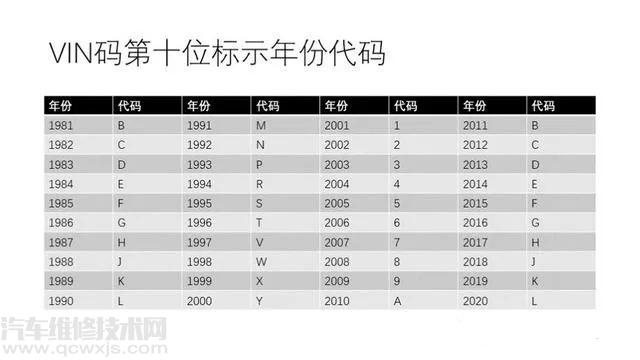表示車輛生產車型年份,該模式每30年重復1次,A=1980/2010,B=1981/2011,C=1982/2012,D=1983/2013,E=1984/2014,F=1985/2015,G=1986/2016,H=1987/2017,J=1988/2018,K=1989/2019,L=1990/2020,M=1991/2021,N=1992/2022,P=1993/2023,R=1994/2024,S=1995/2025,T=1996/2026,V=1997/2027,W=1998/2028,X=1999/2029,Y=2000/2030,1=2001/2031,2=2002/2032,3=2003/2033,4=2004/2034,5=2005/2035,6=2006/2036,7=2007/2037,8=2008/2038,9=2009/2039