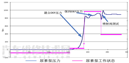 首先打開尿素噴射閥排氣,尿素泵抽取尿素液充滿整個尿素管路,噴射閥關閉。此時尿素噴射管路內部開始建壓,當管路內的壓力達到設定值,尿素回液閥開啟高壓尿素從回液管流回尿素箱,保持尿素噴射管內噴射壓力恒定。尿素噴射管路建壓成功后,尿素噴射閥會開啟進行預噴尿素測試噴射狀態。