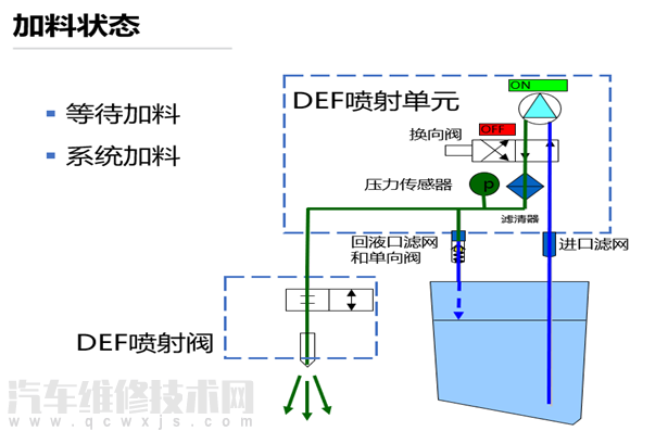 ②DEF噴射單元持續運轉,以保持合適的DEF壓力,所有未經DEF噴射閥使用的DEF都將返回DEF罐;