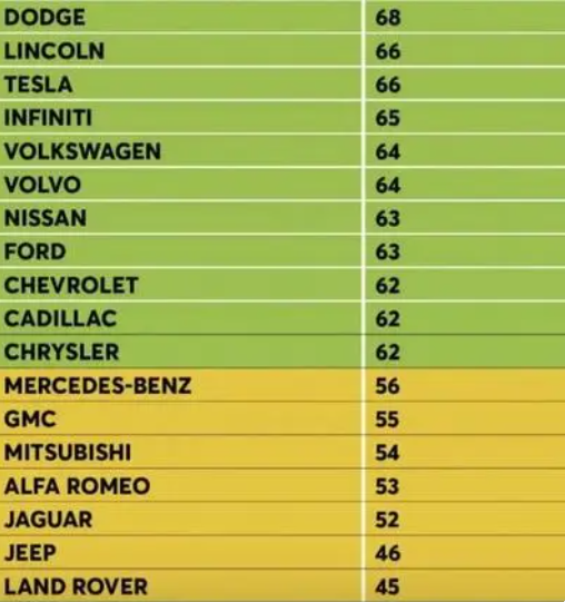 而排名十五至二十位的品牌分別是:道奇汽車(DODGE)、林肯汽車(LINCOLN)、特斯拉汽車(TESLA)、英菲尼迪(INFINITI)、大眾汽車(VLOKSWAGEN)和沃爾沃汽車(VOLVO),它們的質量評分都不足70分,但也都達到了合格線,特斯拉的排名有很大提升,而大眾和沃爾沃的整體表現不太理想。二十一至二十五位的品牌依次是:日產汽車(NISSAN)、福特汽車(FORD)、雪佛蘭汽車(CHEVROLET)、凱迪拉克(CADILLAC)和克萊斯勒(CHRYSLER),日產汽車的排名有所下滑,凱迪拉克也是表現不佳。