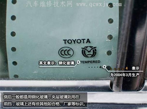 玻璃上....4表示年份,黑點在4前,表示上半年生產,計算公式是“7-黑點數”,例如圖中的車玻璃是....4,就應該是7-4=3,所以這塊玻璃應該是2004年3月份生產的;如果黑點在4后,則表示為下半年生產,計算公式是“13-黑點數”,如“4...”,表示該車玻璃是13-3=10,就是10月生產的。