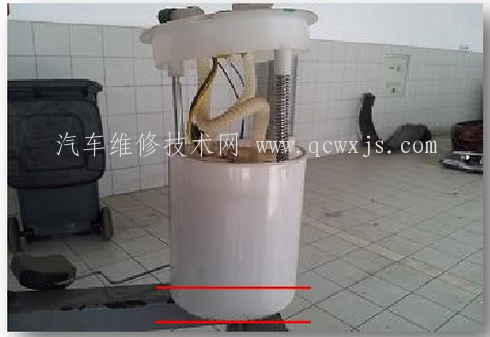 油箱油不充足引起汽油泵損壞當儀表中的燃油油位警告燈點亮時,油箱中大約還剩余7升左右燃油,此時油箱中的燃油液面大概處于圖所示的紅線處。由于油位過低,燃油泵電機得不到充 分的冷卻和潤滑,會造成電機過熱甚至停轉。如果油 泵經常處于這種工作狀態的話,那么油泵的過早損壞就不可避免了。