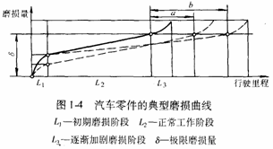 下圖為正常使用情況下汽車零件的典型磨損曲線。 L1為初期磨損或走合期磨損階段, 磨損速率較大;L2為正常工作階段;L3為總磨損量達到極限值后的零件磨損期,此階段的磨損加劇,故障率增加,工作能力急劇下降。