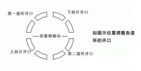 第一道為渡絡環,開口背對燃燒室,有標記的朝上,內圓切槽的朝上,外圓切槽的朝下;第二道環也是如此,與第一道環錯開180度,第三道油環與前兩道錯開90度,成迷宮狀開口要錯開,另外,活塞環開口不能正對活塞銷座孔。